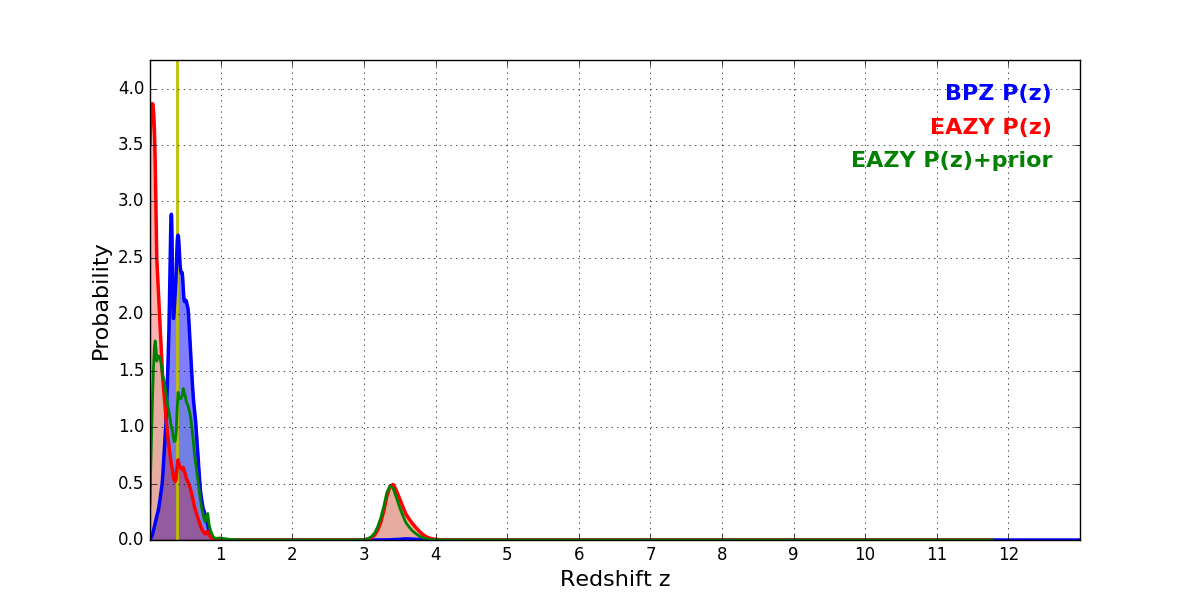 In P(z) plots: Yellow lines mark the cluster redshift z = 0.390,
