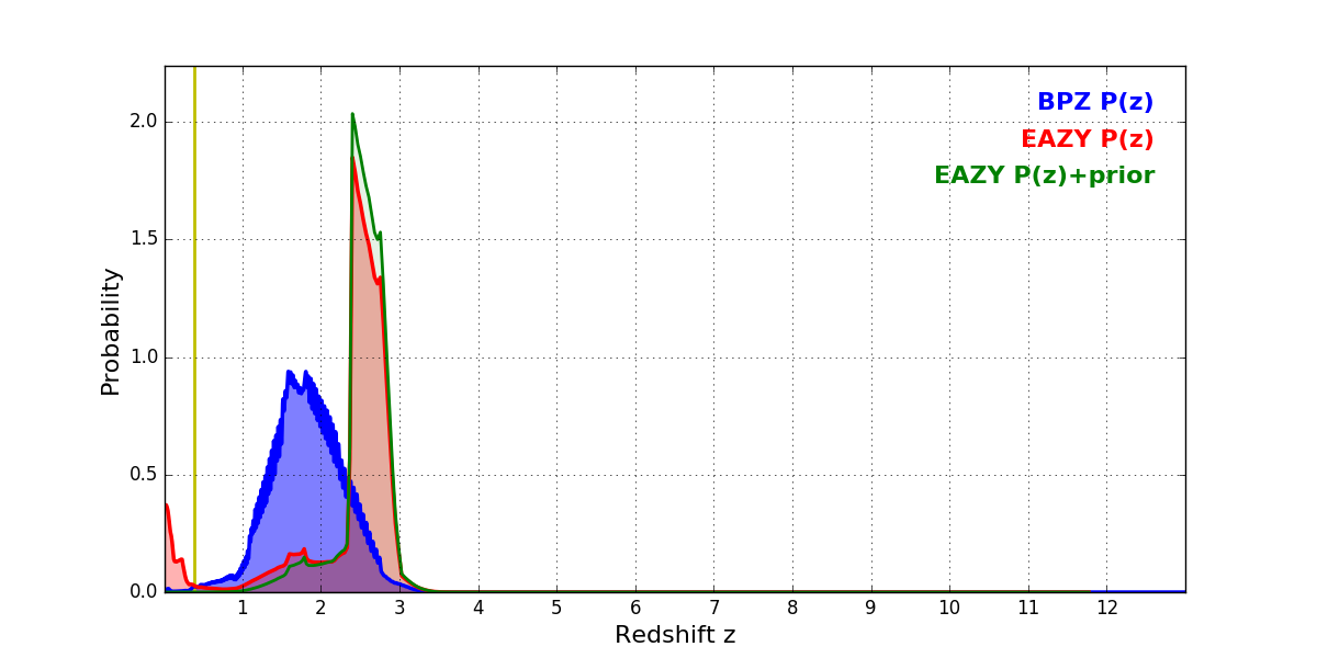 In P(z) plots: Yellow lines mark the cluster redshift z = 0.390,