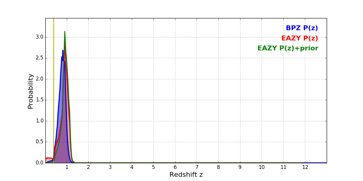 In P(z) plots: Yellow lines mark the cluster redshift z = 0.390,