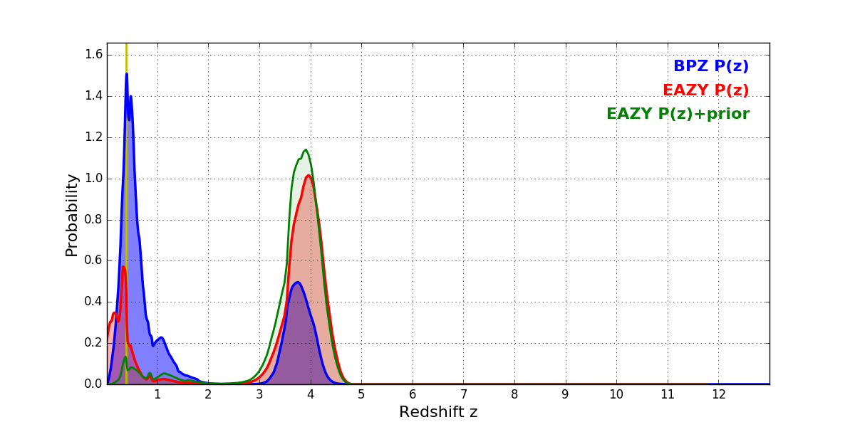 In P(z) plots: Yellow lines mark the cluster redshift z = 0.390,