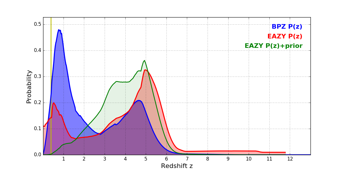 In P(z) plots: Yellow lines mark the cluster redshift z = 0.390,