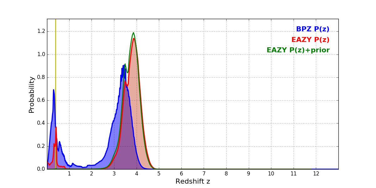 In P(z) plots: Yellow lines mark the cluster redshift z = 0.390,