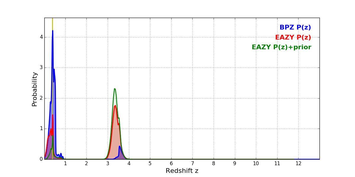 In P(z) plots: Yellow lines mark the cluster redshift z = 0.390,