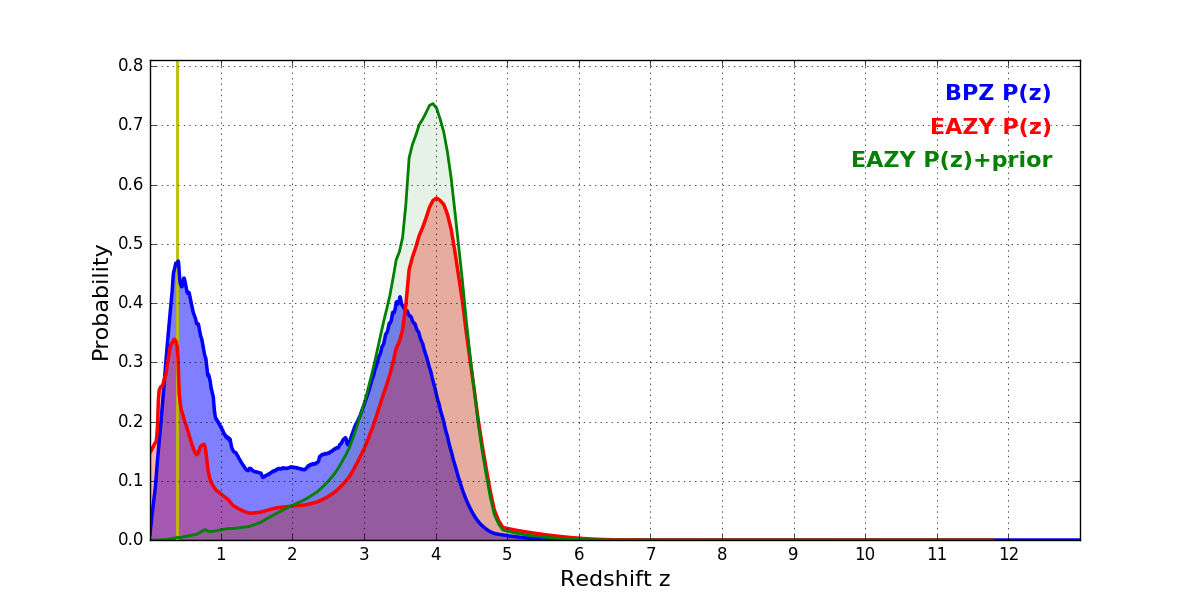 In P(z) plots: Yellow lines mark the cluster redshift z = 0.390,