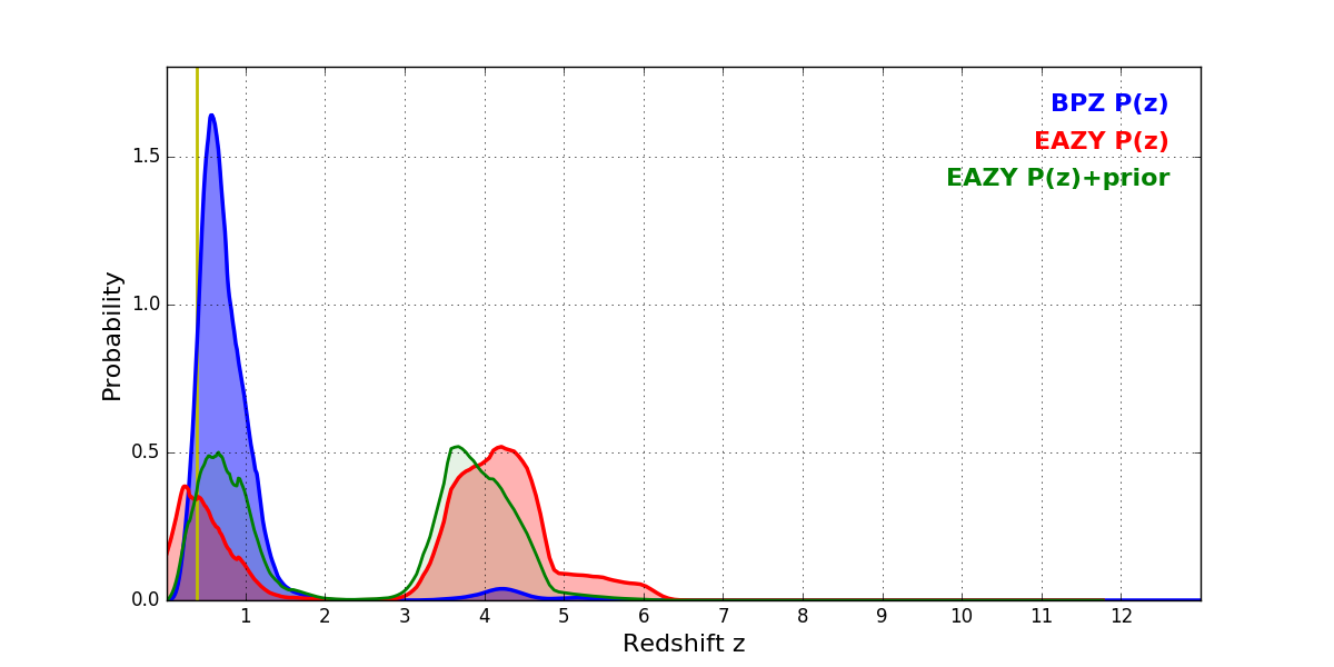 In P(z) plots: Yellow lines mark the cluster redshift z = 0.390,