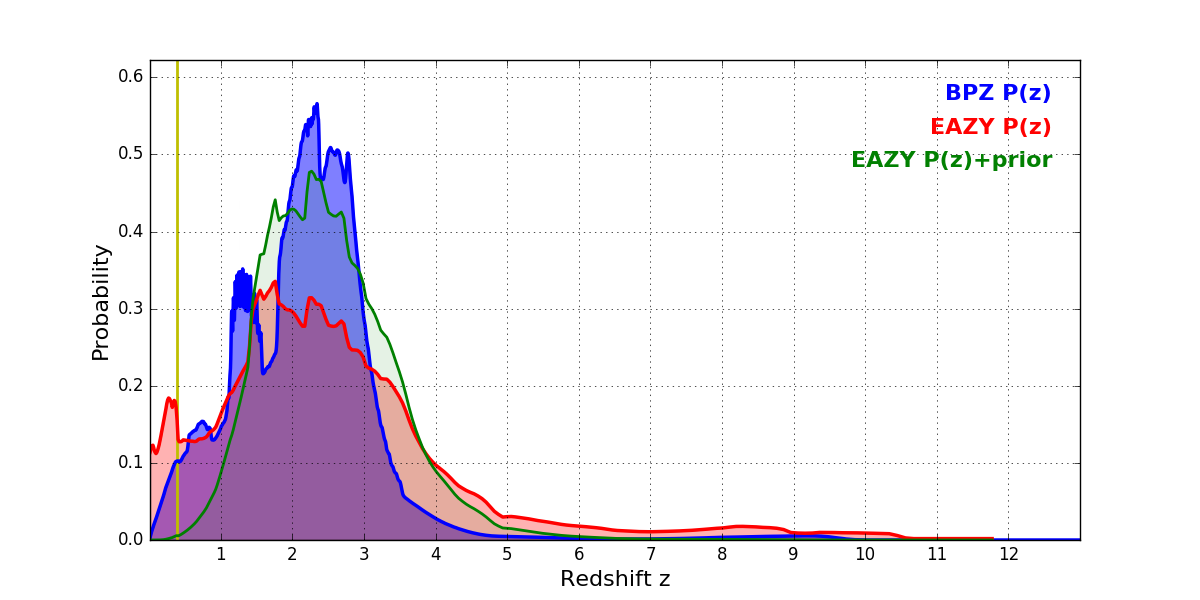 In P(z) plots: Yellow lines mark the cluster redshift z = 0.390,
