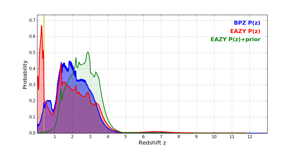 In P(z) plots: Yellow lines mark the cluster redshift z = 0.390,
