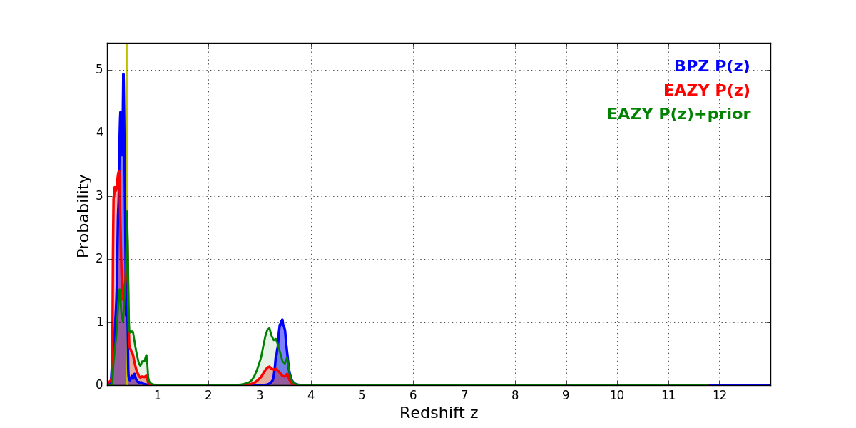 In P(z) plots: Yellow lines mark the cluster redshift z = 0.390,