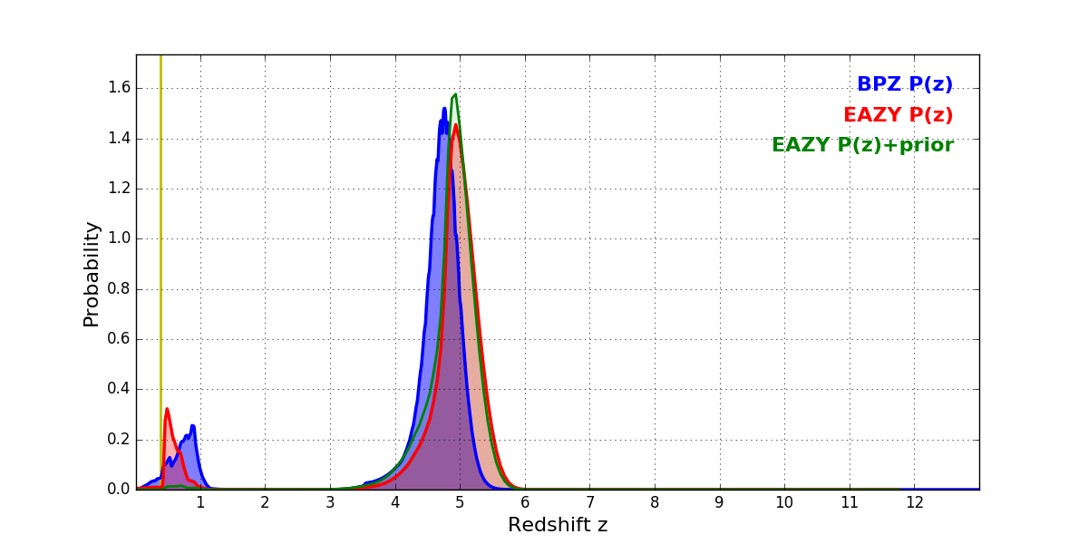 In P(z) plots: Yellow lines mark the cluster redshift z = 0.390,