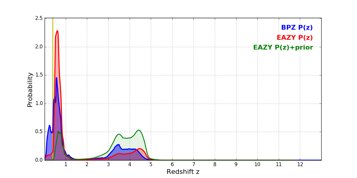 In P(z) plots: Yellow lines mark the cluster redshift z = 0.390,