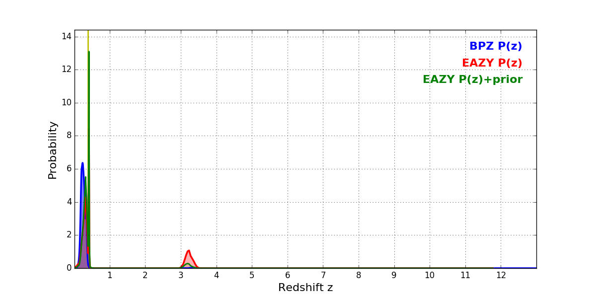 In P(z) plots: Yellow lines mark the cluster redshift z = 0.390,