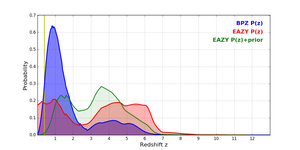 In P(z) plots: Yellow lines mark the cluster redshift z = 0.390,
