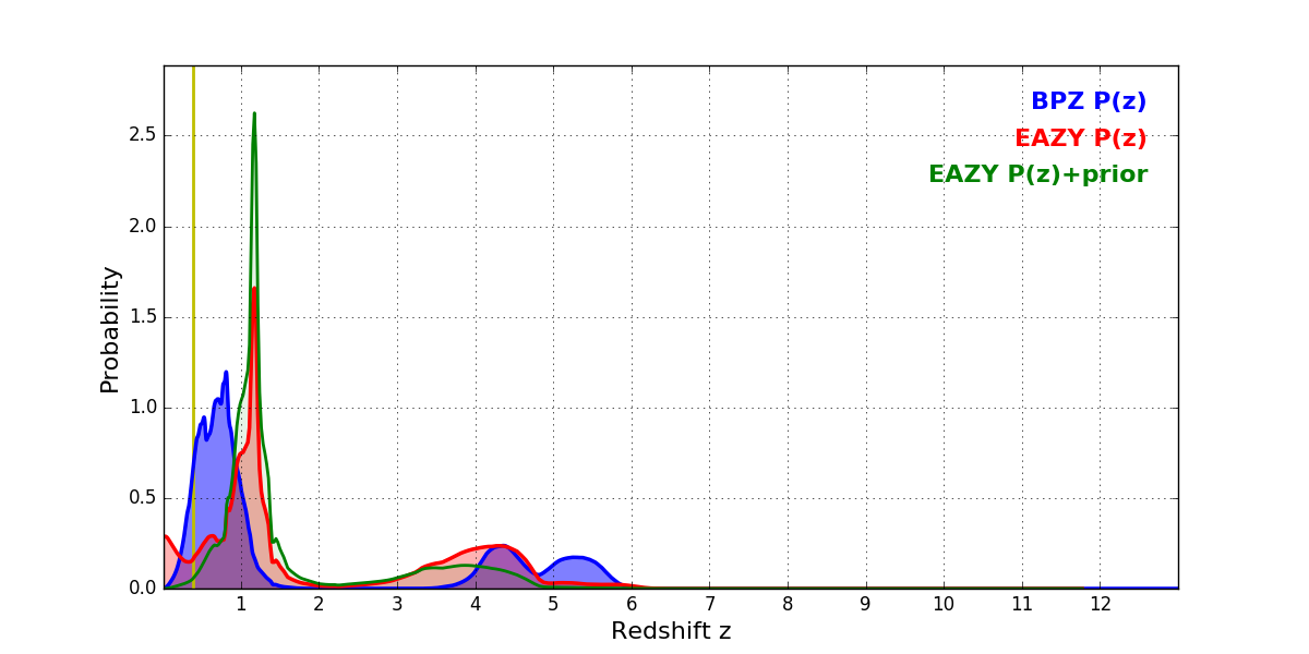 In P(z) plots: Yellow lines mark the cluster redshift z = 0.390,