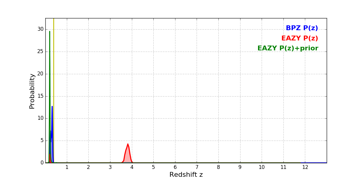 In P(z) plots: Yellow lines mark the cluster redshift z = 0.390,
