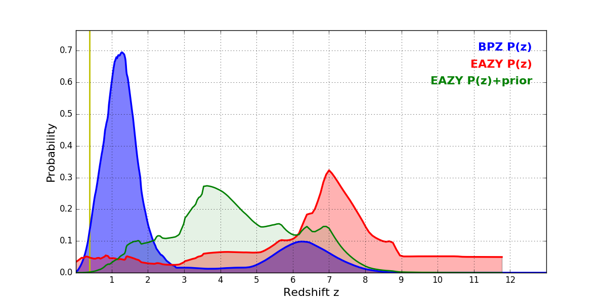 In P(z) plots: Yellow lines mark the cluster redshift z = 0.390,