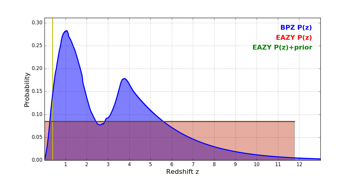 In P(z) plots: Yellow lines mark the cluster redshift z = 0.390,