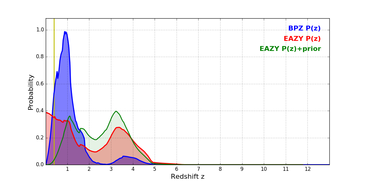 In P(z) plots: Yellow lines mark the cluster redshift z = 0.390,