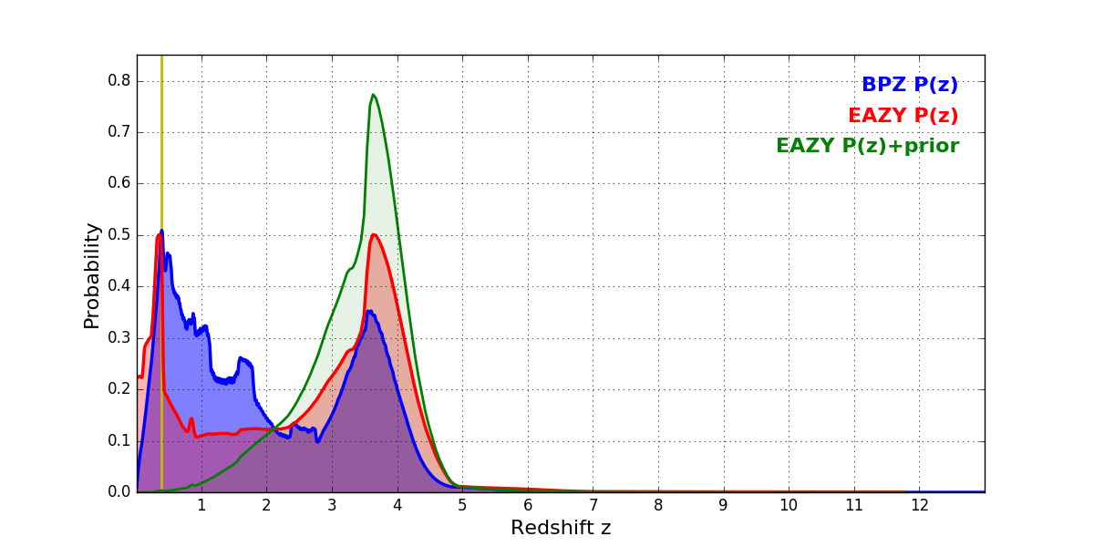 In P(z) plots: Yellow lines mark the cluster redshift z = 0.390,