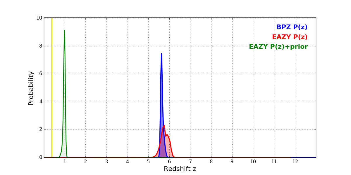 In P(z) plots: Yellow lines mark the cluster redshift z = 0.390,