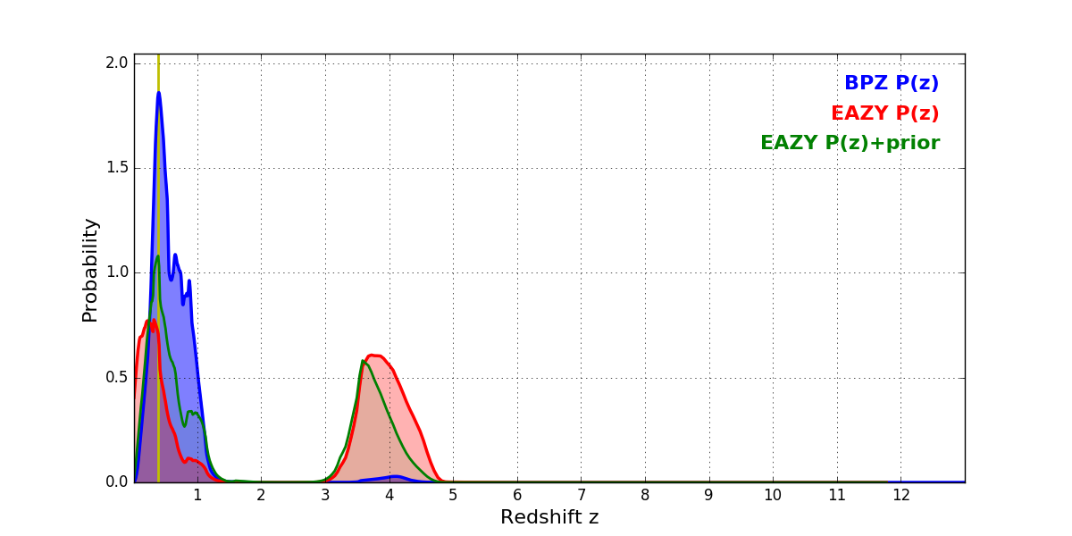 In P(z) plots: Yellow lines mark the cluster redshift z = 0.390,