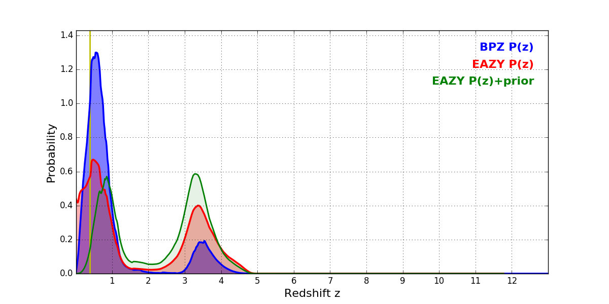 In P(z) plots: Yellow lines mark the cluster redshift z = 0.390,
