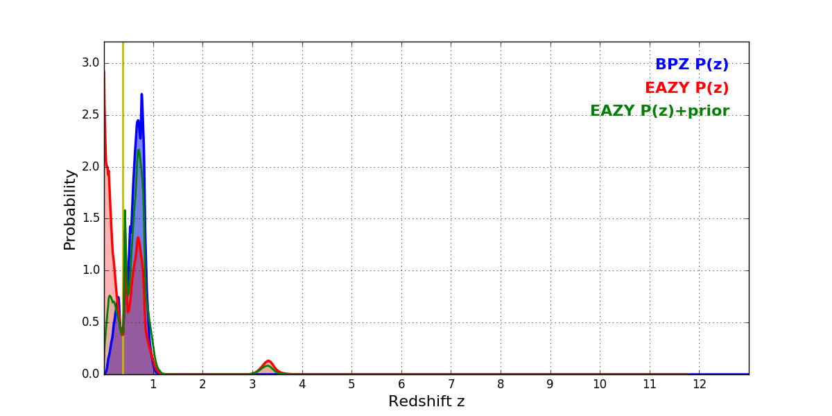 In P(z) plots: Yellow lines mark the cluster redshift z = 0.390,
