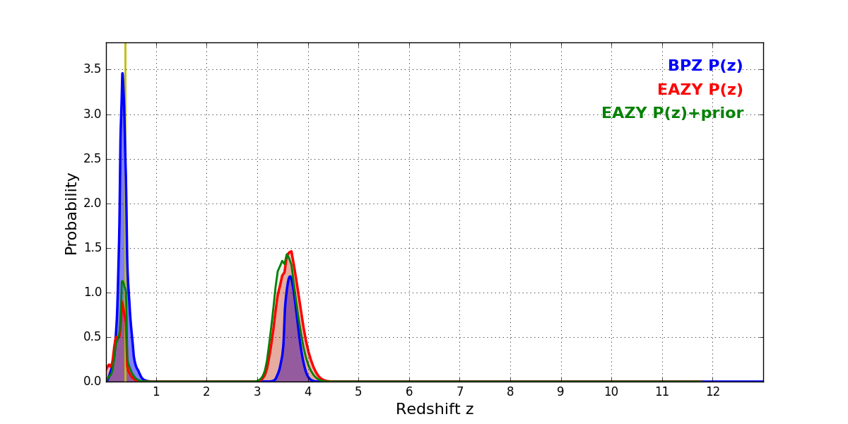 In P(z) plots: Yellow lines mark the cluster redshift z = 0.390,