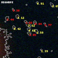 Black segments are analyzed here. Roll mouse over color images to view segments. Best viewed in a wide browser window (1200 pixels or more). Download SED & P(z) plots to view larger versions.