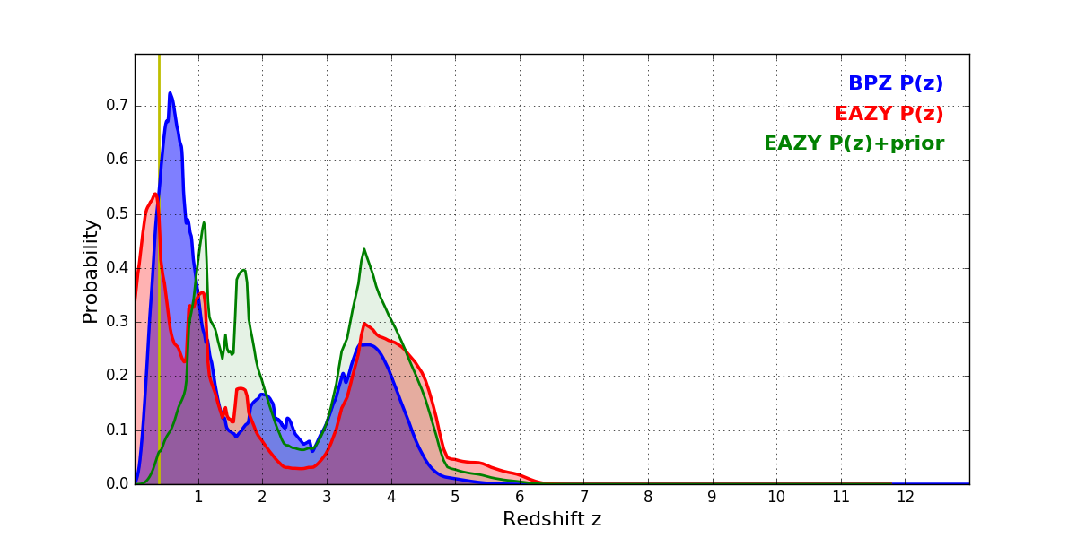 In P(z) plots: Yellow lines mark the cluster redshift z = 0.390,