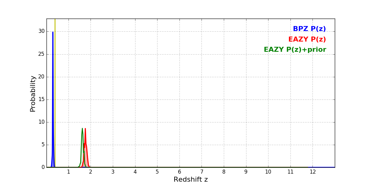 In P(z) plots: Yellow lines mark the cluster redshift z = 0.390,