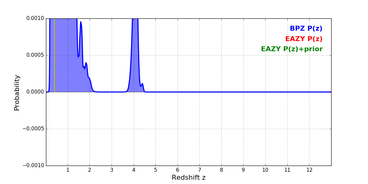In P(z) plots: Yellow lines mark the cluster redshift z = 0.390,