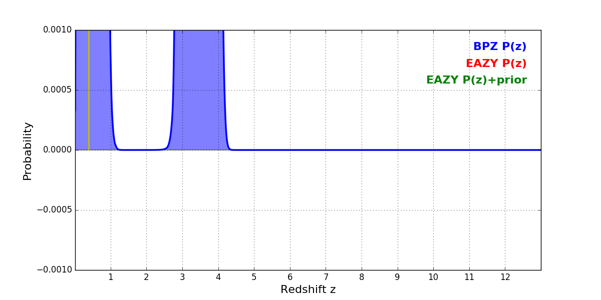 In P(z) plots: Yellow lines mark the cluster redshift z = 0.390,