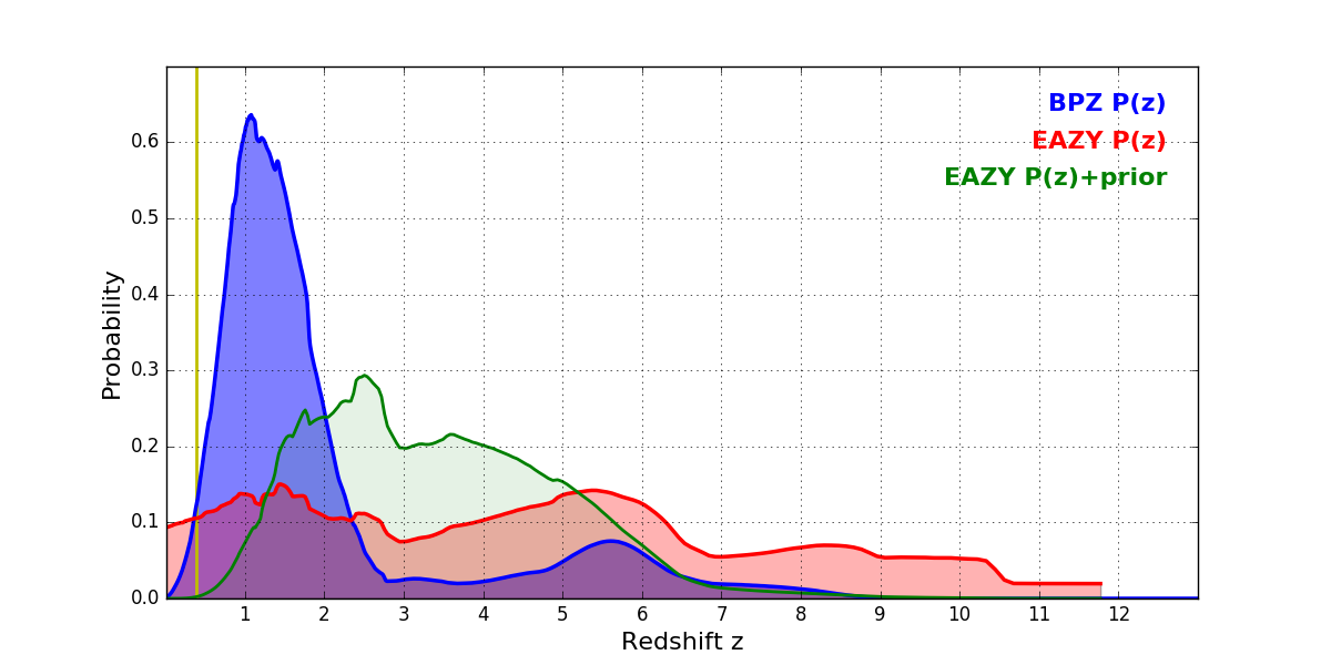 In P(z) plots: Yellow lines mark the cluster redshift z = 0.390,
