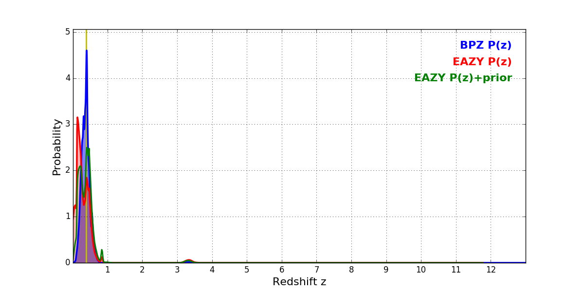 In P(z) plots: Yellow lines mark the cluster redshift z = 0.390,