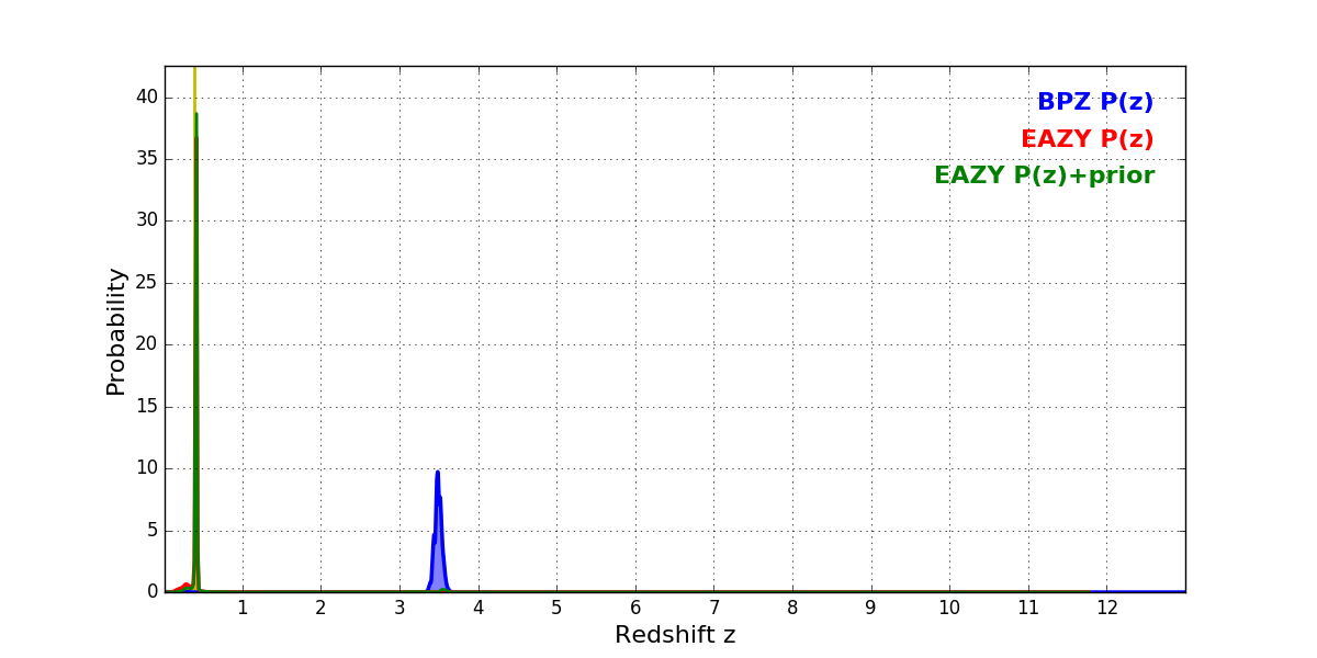 In P(z) plots: Yellow lines mark the cluster redshift z = 0.390,