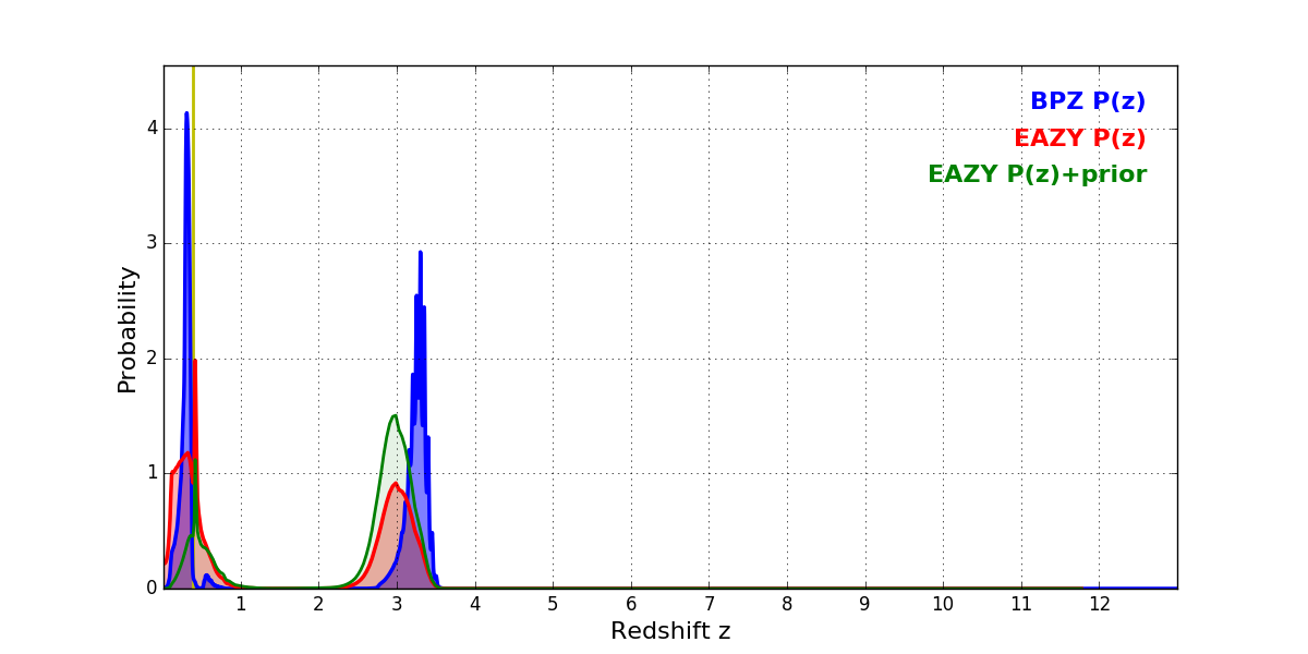 In P(z) plots: Yellow lines mark the cluster redshift z = 0.390,