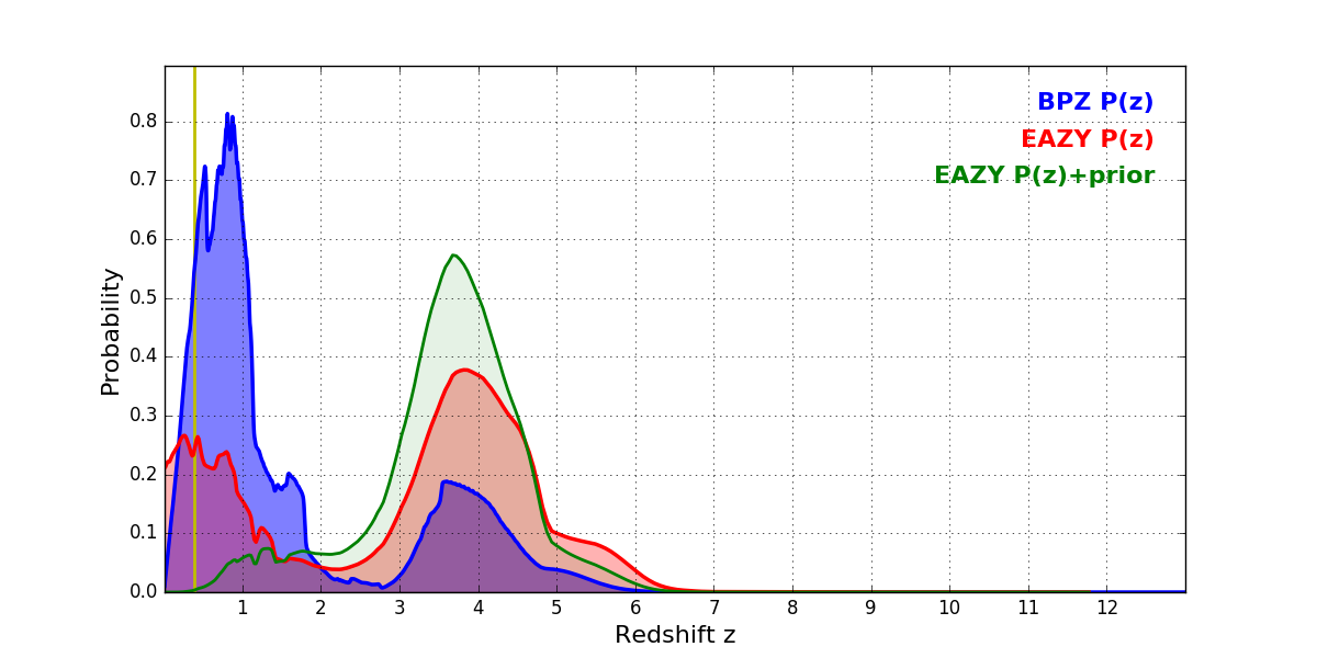 In P(z) plots: Yellow lines mark the cluster redshift z = 0.390,