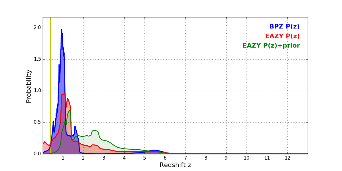 In P(z) plots: Yellow lines mark the cluster redshift z = 0.390,