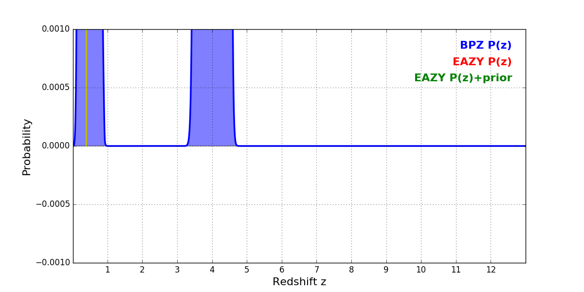 In P(z) plots: Yellow lines mark the cluster redshift z = 0.390,