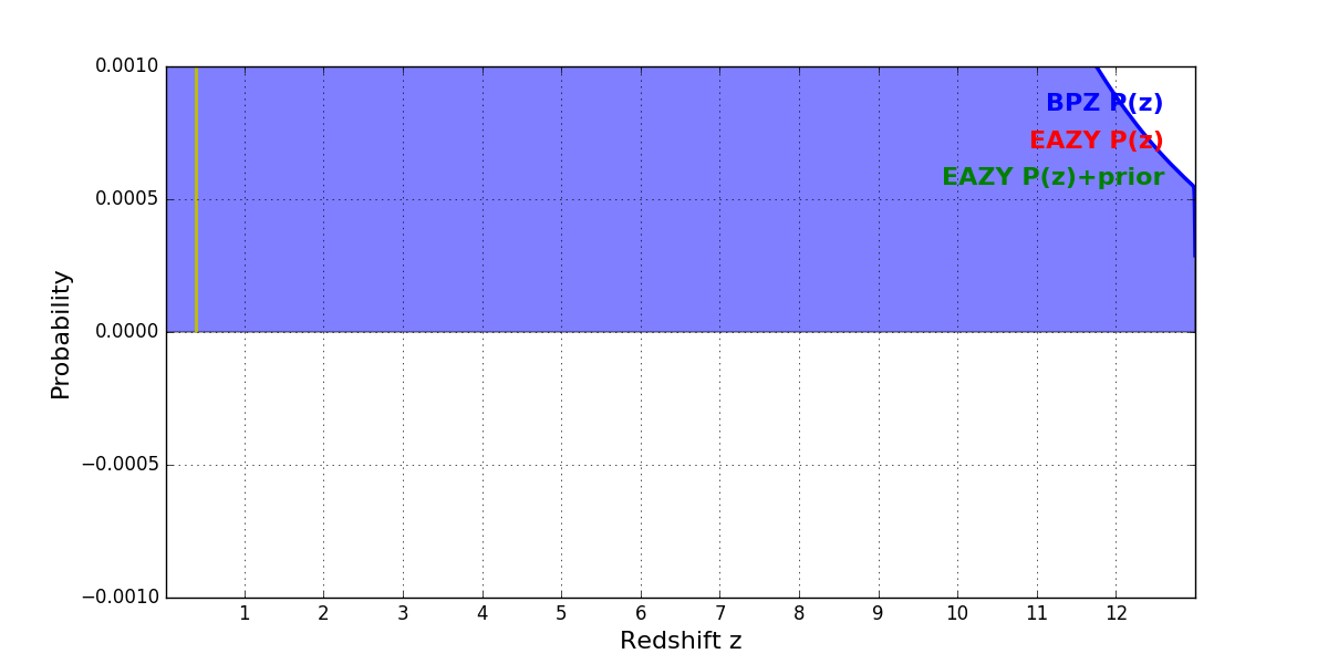 In P(z) plots: Yellow lines mark the cluster redshift z = 0.390,