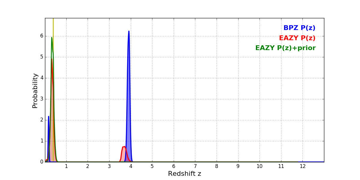 In P(z) plots: Yellow lines mark the cluster redshift z = 0.390,