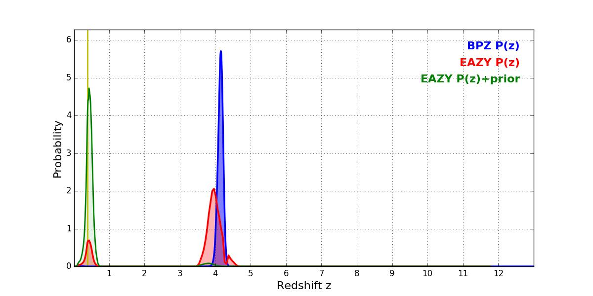 In P(z) plots: Yellow lines mark the cluster redshift z = 0.390,