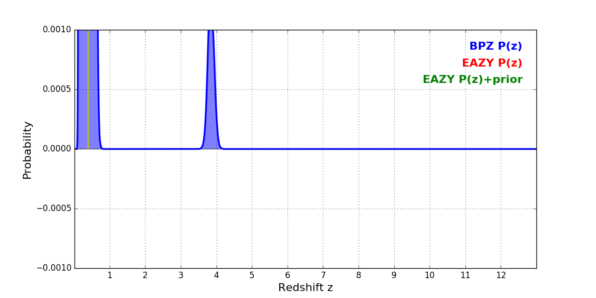 In P(z) plots: Yellow lines mark the cluster redshift z = 0.390,