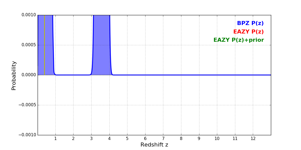 In P(z) plots: Yellow lines mark the cluster redshift z = 0.390,