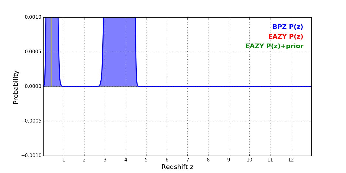In P(z) plots: Yellow lines mark the cluster redshift z = 0.390,