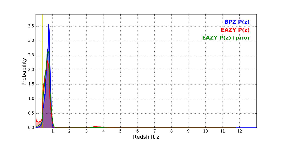 In P(z) plots: Yellow lines mark the cluster redshift z = 0.390,
