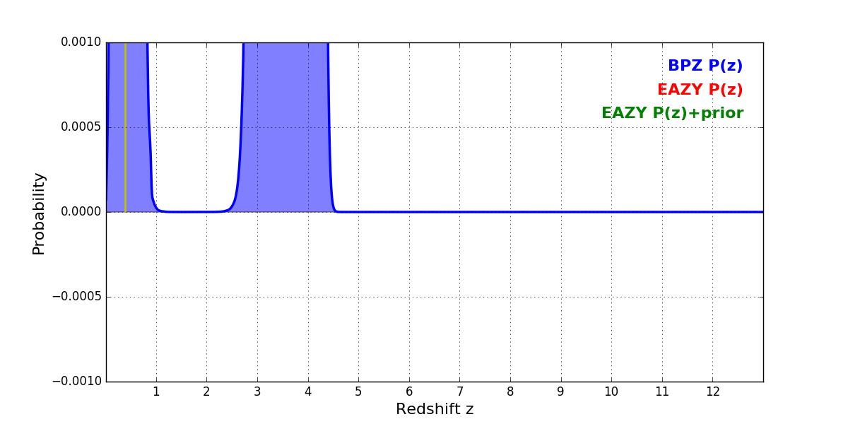 In P(z) plots: Yellow lines mark the cluster redshift z = 0.390,