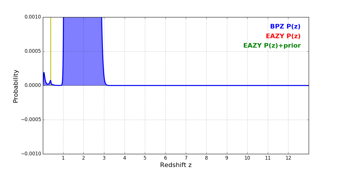 In P(z) plots: Yellow lines mark the cluster redshift z = 0.390,