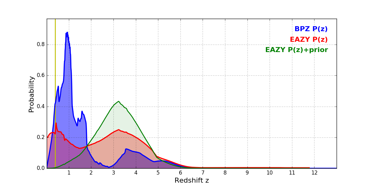 In P(z) plots: Yellow lines mark the cluster redshift z = 0.390,