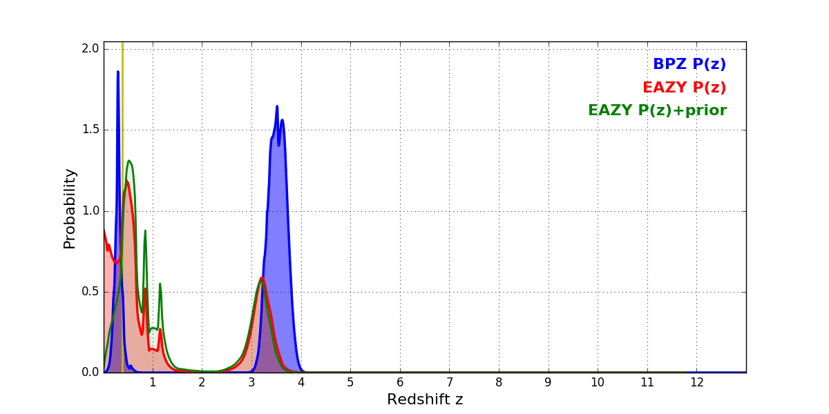 In P(z) plots: Yellow lines mark the cluster redshift z = 0.390,
